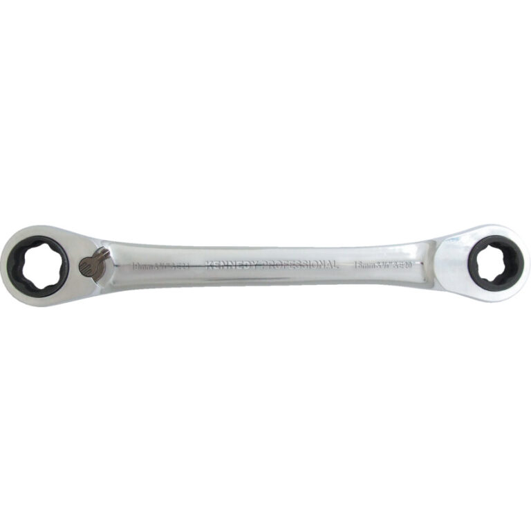 Double ended ratchet spanners with four sizes each, saving space and weight in the toolbox. 72 teeth lever ratcheting system