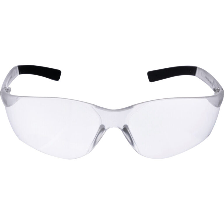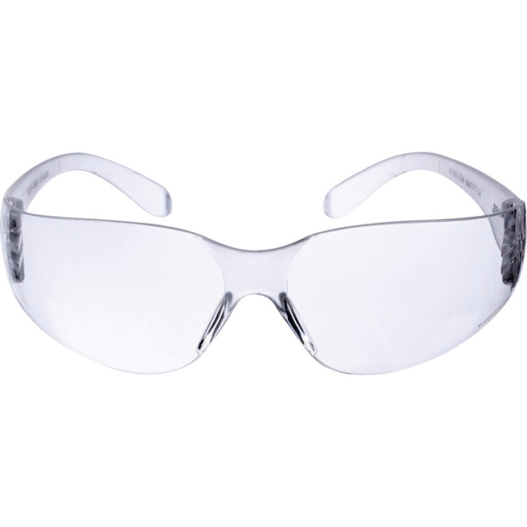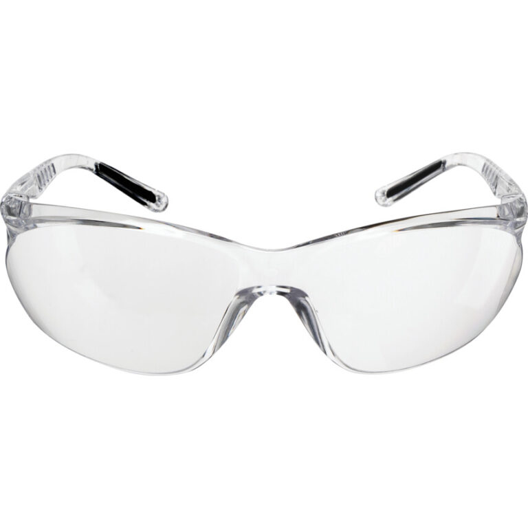 Clear wrap around polycarbonate lens safety glasses. Finished with a black sidearm grip to hold the glasses in place whilst