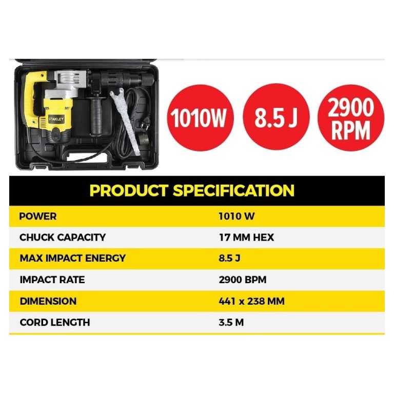 Features & Benefits:- • 1010W powerful motors deliver outstanding chipping and chiseling performance • Anti-vibration system for low vibration and