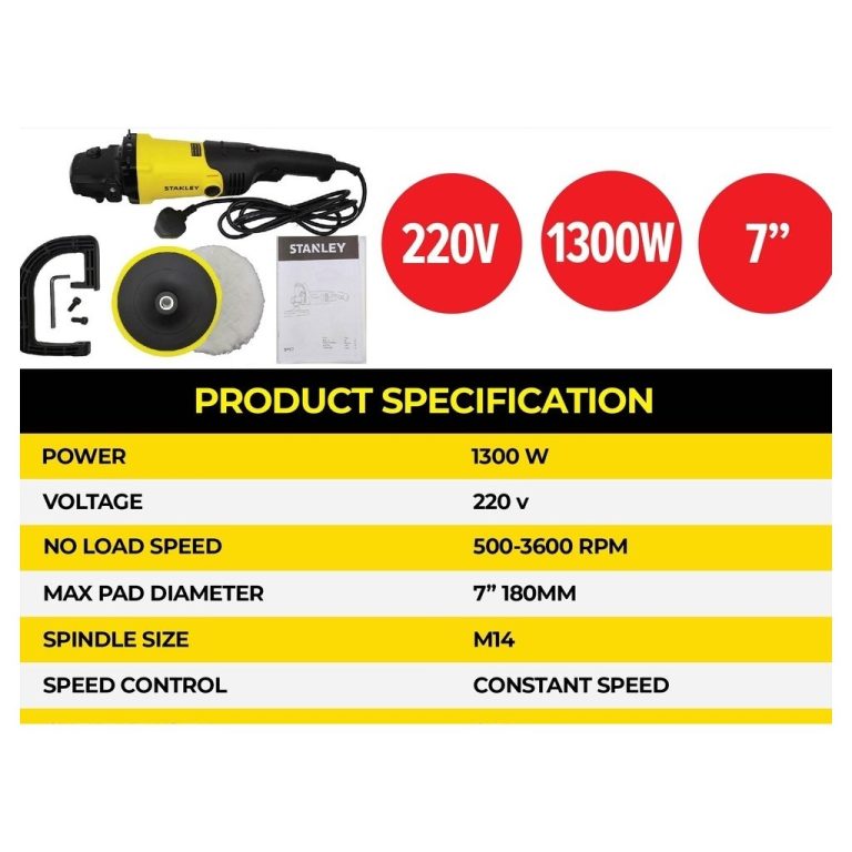 STANLEY SP137 POLISHER 7″ 180MM 1300W Description: Powerful 1300W motor for long life & performance. Soft start & constant speed