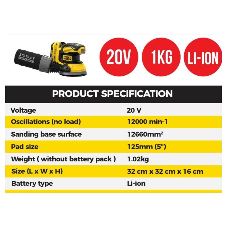 Stanley SCS220-B1 20V Cordless 125mm ( 5″ ) Orbital Sander ( Bare Unit ) Specifications  Model : SCS220  Voltage :