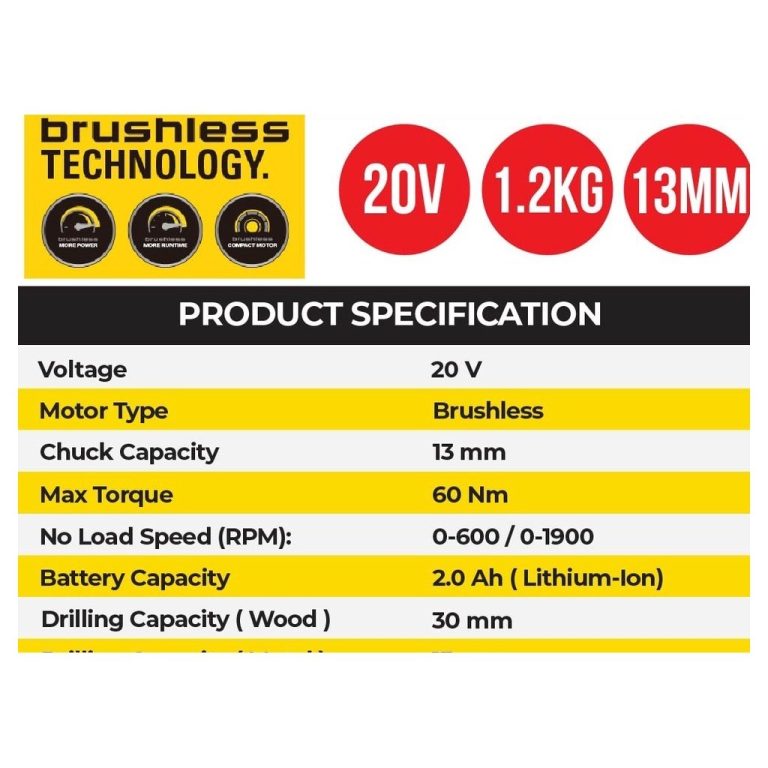 STANLEY SBD710D2K 20V Cordless Brushless Drill Driver With 2×2.0Ah Battery & 1 Charger (20V 430-1700RPM 55nm) SBD710D2K