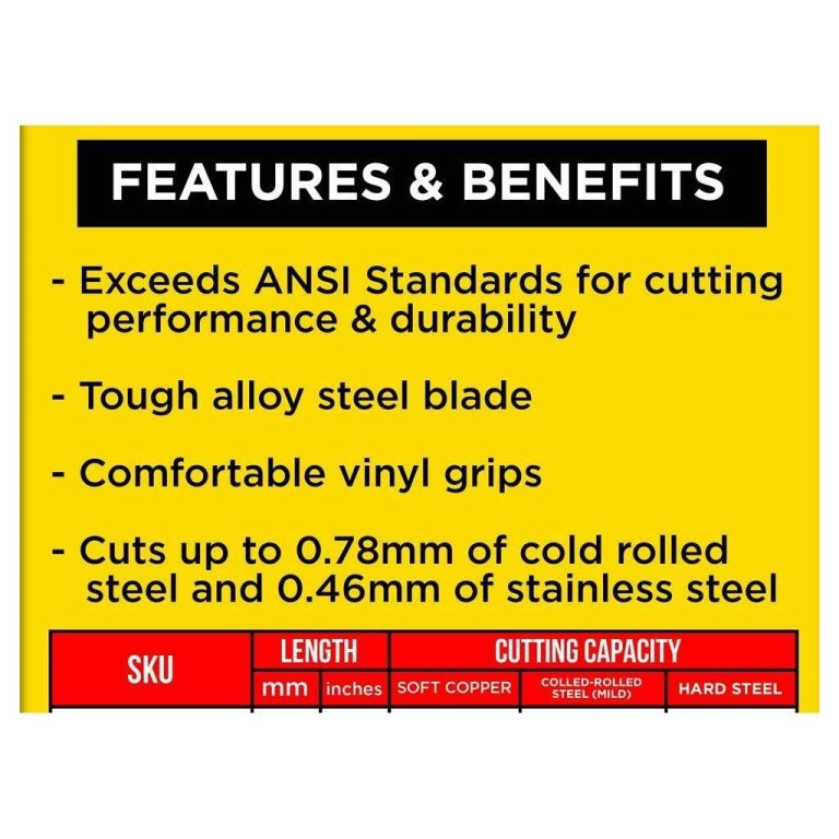 Stanley max steel 12-inch straight pattern snip FEATURES & BENEFITS: – Serrated cutting edge to prevent slippage – Made with