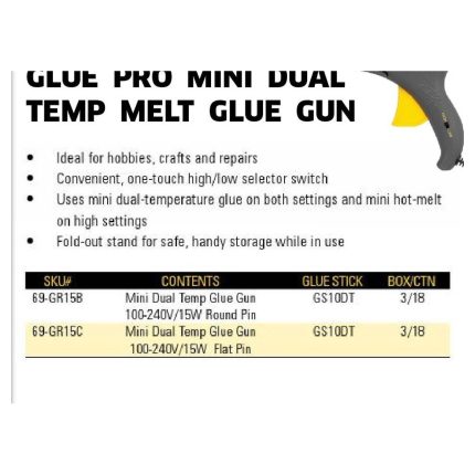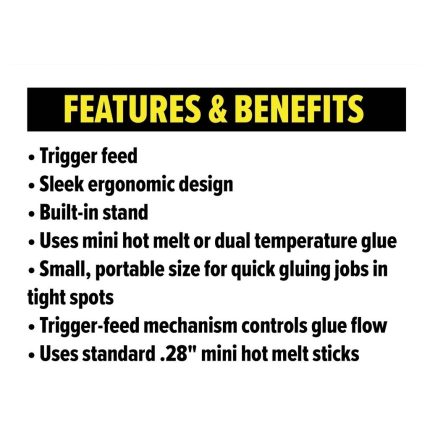 PRODUCT FEATURES : -Ideal for hobbies, crafts and repairs -Convenient, one-touch high/low selector switch -Uses mini dual-temperature glue on both