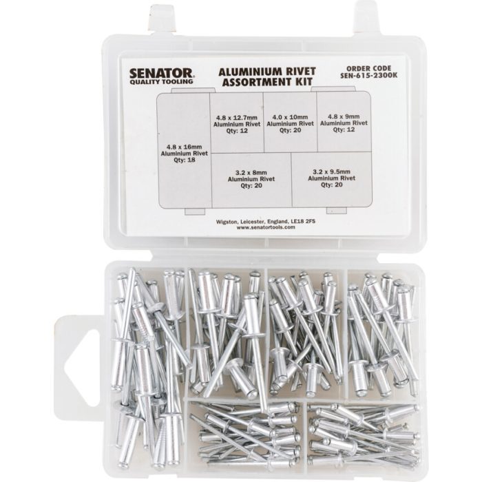 Supplied in a transparent plastic box, this 102 piece rivet set contains metric sized aluminium rivets. The set contains sizes 3.2 x 8mm all the way up to 4.8 x 16mm to suit a variety of needs.