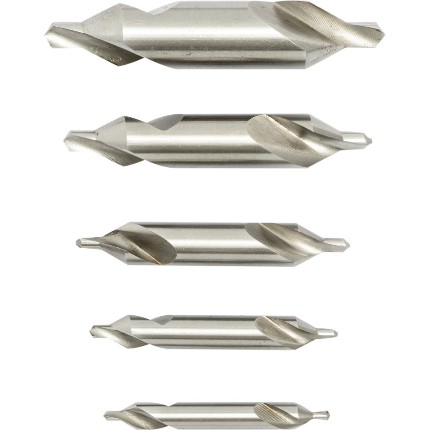5 piece metric set of centre drills manufactured from a durable HSS with a bright finish for increased tool efficiency and lifespan.
