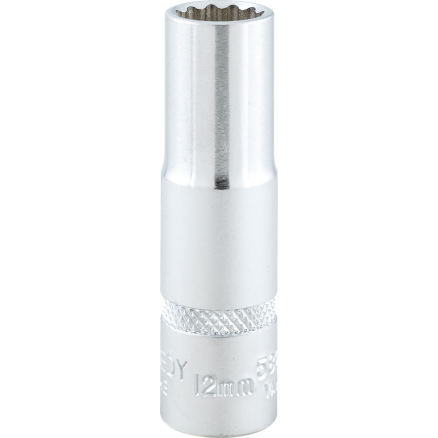 Available in a range of metric sizes, these 3/8″ square drive, bi-hexagon deep sockets offer superior torque with minimal user exertion. Manufactured from chrome vanadium steel and complete with a chrome-plated, polished mirror finish. With a 12 point side and side drive, the deep socket gives a higher torque than normal sockets, grips worn nuts and will not round off existing nuts. Each socket possesses a ball-retaining groove on each face of the square drive, which ensures a positive fit with accessories. Requires only a one-twelfth turn to engage the next point of the socket.