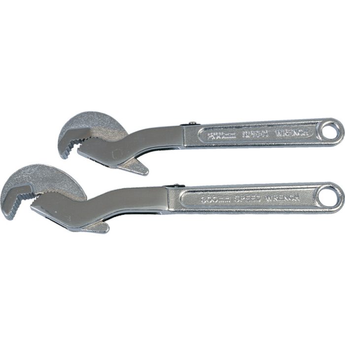 Contains two multi-purpose self-adjusting wrenches 200mm (8”), maximum capacity 25mm and 300mm (12”), maximum capacity 35mm. Can be used on pipes, nuts and bolts and will also grip rounded nuts. Manufactured from fully chrome-plated drop forged steel.
