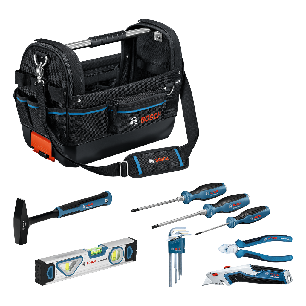 - Essential set for maximum mobility — open tool bag and 8 Bosch Professional hand tools for perfect flexibility