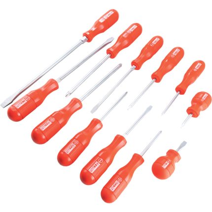 Featuring both flared and crosspoint screwdrivers, this 7 piece set of screwdrivers is suited for professional use. With hexagonal blades constructed from chrome vanadium steel and striking heads, each screwdriver is suitable for striking with a hammer to free up seized screws. Complete with a fully hardened magnetic tip and a comfortable moulded grip handle, the set is supplied in a display case.