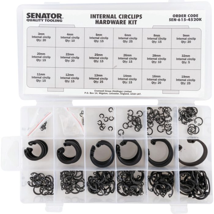 This metric interior circlip set includes 300 pieces with diameters ranging from 3mm to 32mm. Commonly used in spindles on motors, turbines and pistons and often also referred to as retaining rings, snap rings or c-clips, these circlips are constructed from durable spring steel and are black oxide treated for extra strength. Supplied in a transparent plastic box.