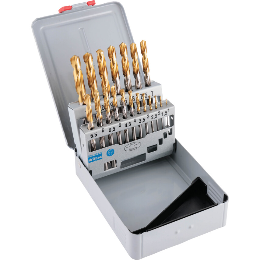 Jobber Drill Set, 1mm to 10mm x 0.5mm, Standard Length, Metric, High Speed Steel, TiN-Tipped, Set of 19