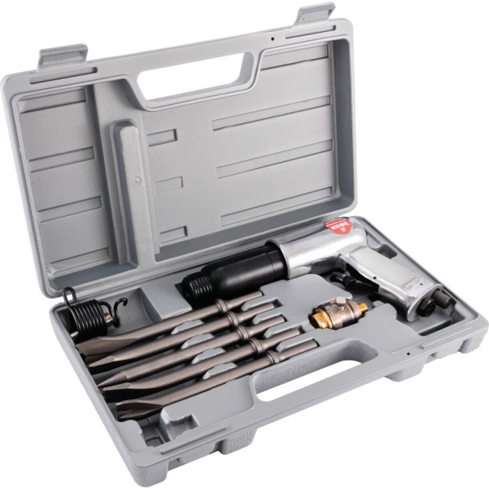 Supplied with flat chisel, spot weld breaker, taper punch, rivet cutter and sheet metal cutter. Hard hitting long stroke. Accepts all standard 0.401″ shank tools. 1/4″ NPT air inlet thread for 10mm air hose, 90psi air pressure, 4cfm* air consumption.