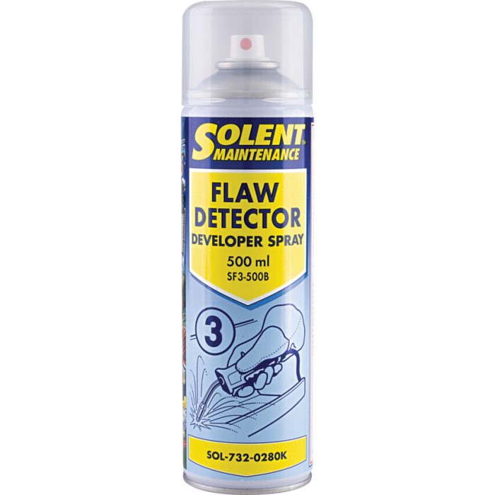 Detects flaws such as cracks, pin holes, welding laps and porousness either during manufacture or on site. A three part system. SFD-501C is a cleaner. SFD-502C is a dye penetrant. SFD-503C is a developing fluid that reacts with the dye in SFD-502C to show small cracks in the weld. Each part supplied in an ozone friendly 500ml aerosol.