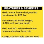 The STANLEY®12″ Solid Frame Hacksaw allows for a 4.375-inch cutting depth and can handle many cutting applications. If you want comfortable operation and smooth cuts for your pro or DIY jobs, this hand saw is a great choice.