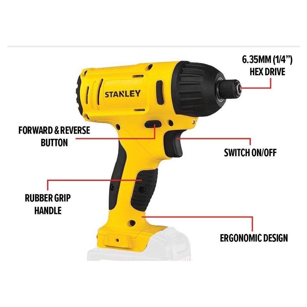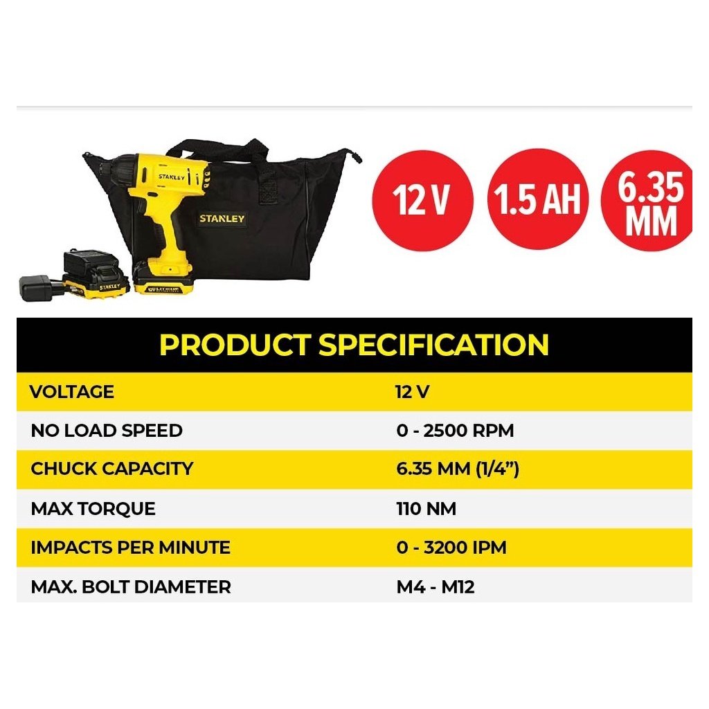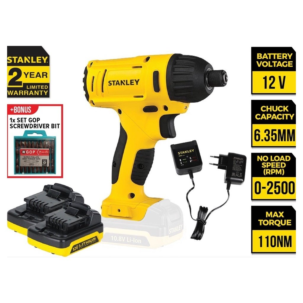 STANLEY Impact Driver (12V/2500RPM 3200OPM) + Battery (2 x 1.5Ah) + Charger (1 Pc) SCI121S2-B1