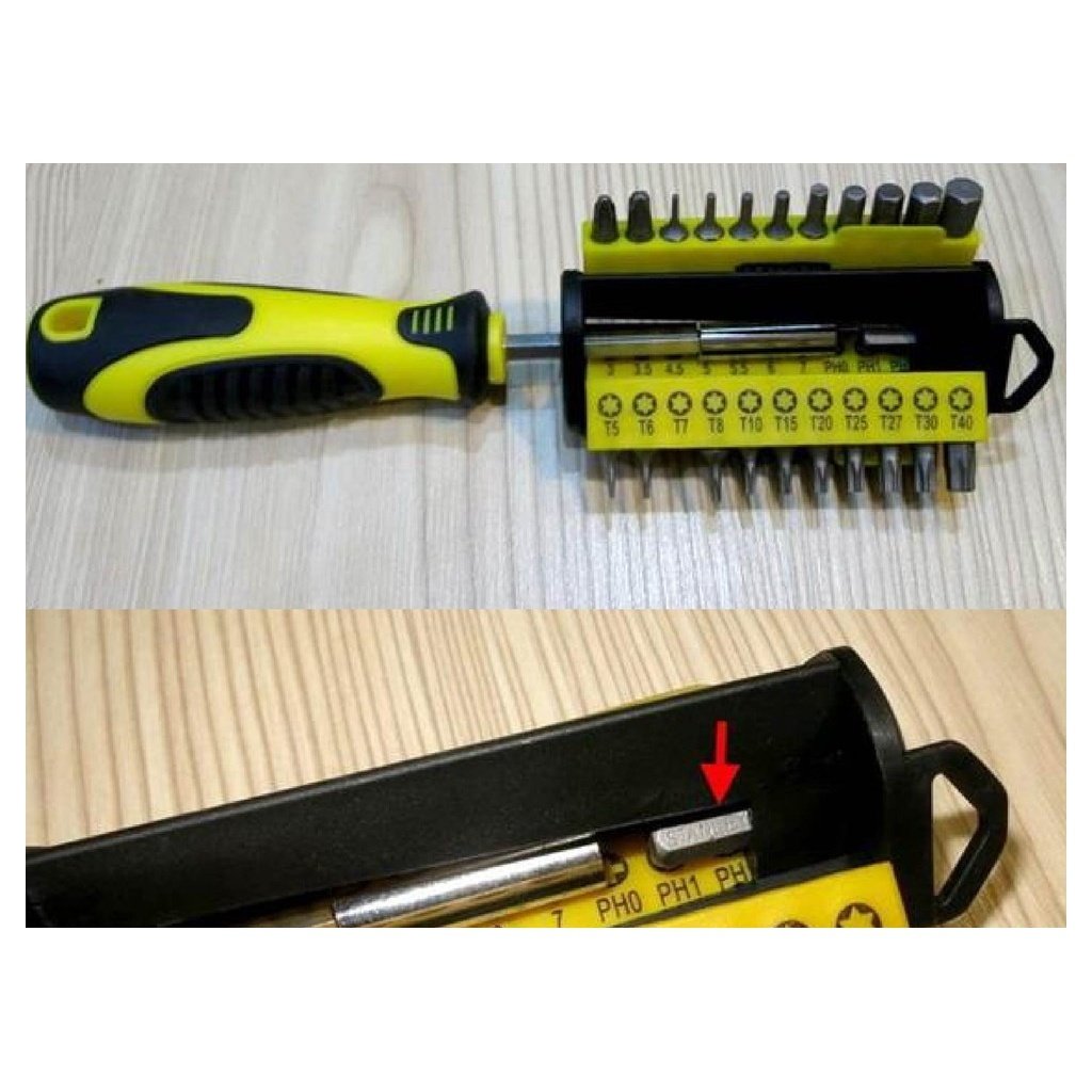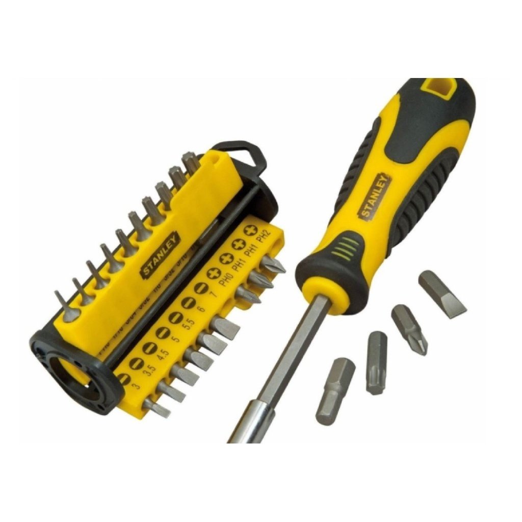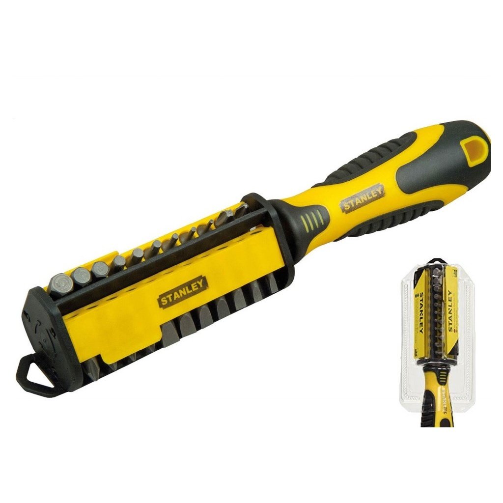 The Stanley 0-70-885 35 piece screwdriver set includes all the popular screwdriver sizes and has a compact design and rubber moulded handle for extra comfort. the unique case holds bits in place that would otherwise be lost, providing a secure storage solution. magnetic bit holder allows for the quick and secure changeover.
