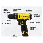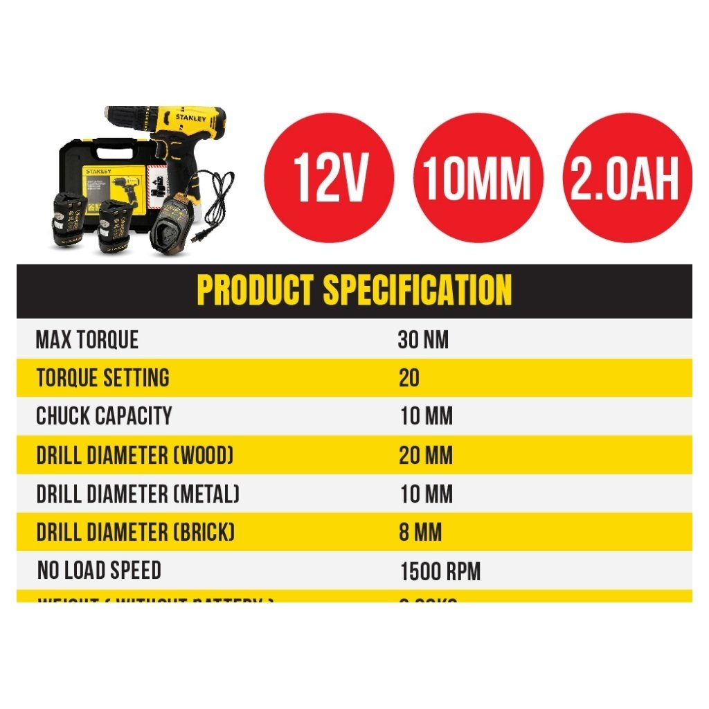 Stanley SCH10D2K Cordless Hammer Drill Driver 12V | 10MM Come With 2x 2.0AH Battery & 1x Charger / Gerudi Tukul