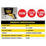 – 550W Powerfull Motor Suitable For Aluminium Tapping And Hard Wood Drilling.