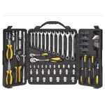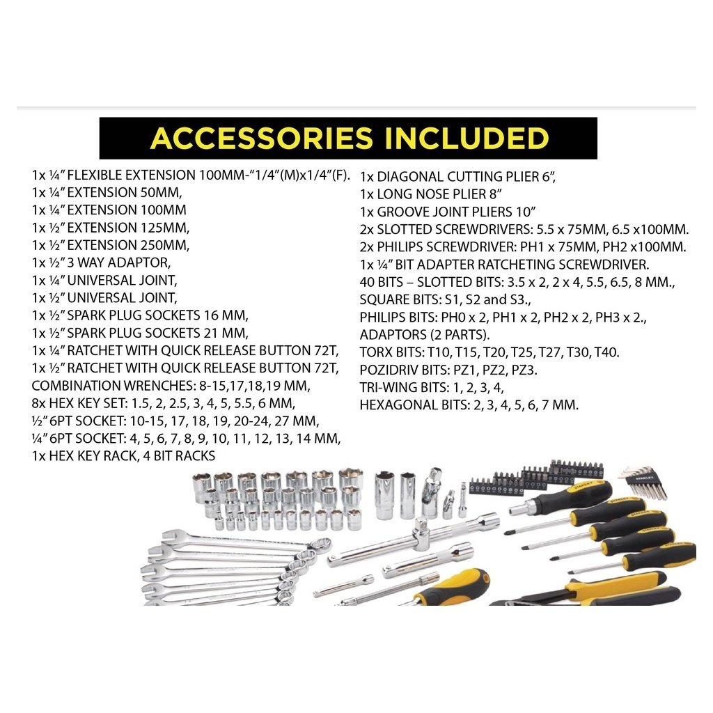 110 Multi tool set of cutting, long nose, and groove joint pliers. Slotted and Philips screw drivers. Bit adapter ratcheting screwdriver with slotted, square, and Philips bits. Hex key sets and 1 Hex key rack. 1/2 and 1/4 inch ratchets with the quick-release button. Combination wrenches. 1/2 and 1/4 inch 6-Point sockets, 4-bit racks