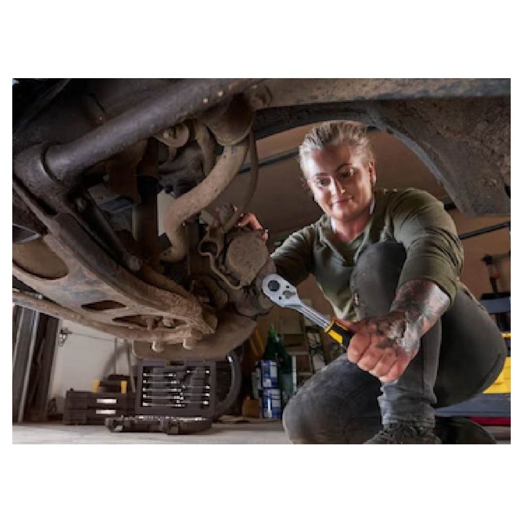 The STANLEY® 1/4 in. 72 Tooth Ratchet is made with fine 72-teeth that allows for 5° increments, ensuring tightening capacity and accuracy within narrow spaces. It comes with a large, flush quick release button for easy socket removal. The STANLEY® 3/8 in. 72 Tooth Ratchet is suitable for all environments. This versatile STANLEY® 3/8 in. 72 Tooth Ratchet has been designed for efficiency and productivity. Comfort is guaranteed thanks to the bi-materiel handle, which provides good grip preventing accidental switching and allows for easy, one-handed operation.