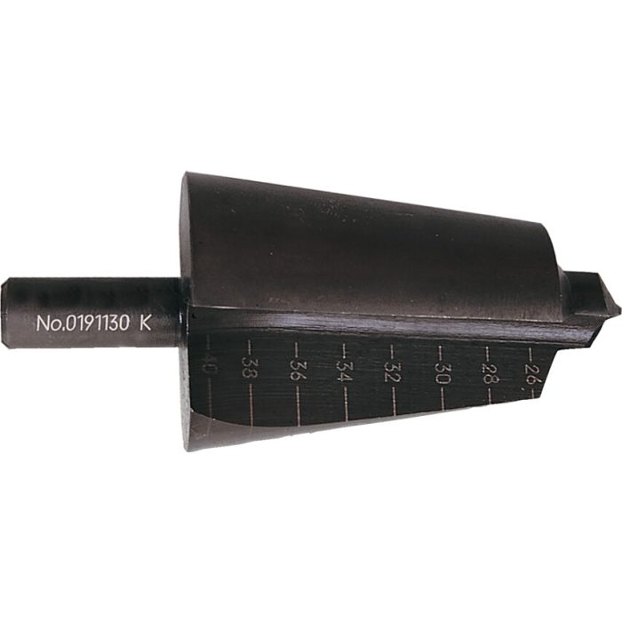 For producing clean holes in sheet metal and other thin-walled materials. Efficient cutting geometry, no pre-drilled pilot hole and the diameter of the finished hole is infinitely variable within the range of each drill, according to depth of feed.