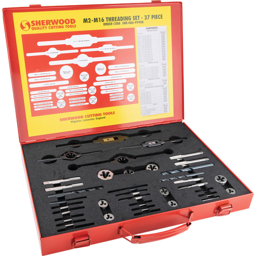 Featuring a selection of machine ground HSS taps and dies in a metal carry case the Sherwwod Metric and Imperial threading set of 37 which contains M2-M16 taper and second taps along with imperial bar wrenches and tapping drills from 1.6mm to 10.2mm.